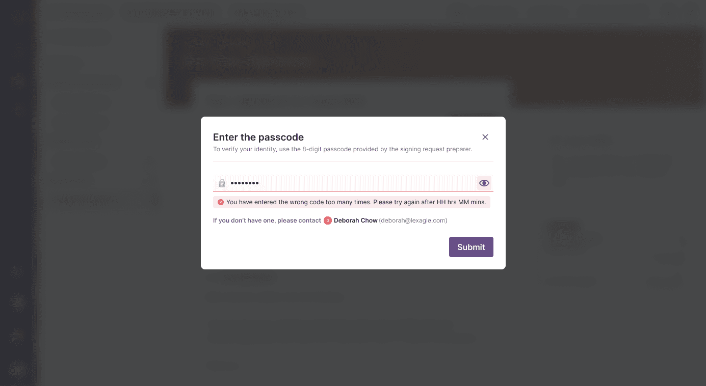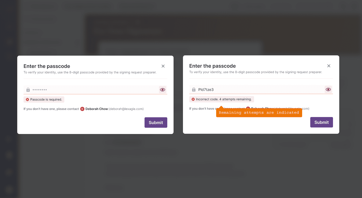 Signatories are notified in cases of [1] missing mandatory field input, and [2] incorrect passcode, as well as remaining attempts for better and guided user confidence.