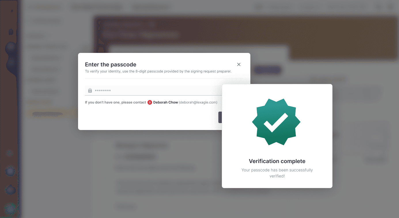 Signatories can input the preparer-provided passcode and submit to complete verification.